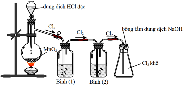 Khí Cl2 sinh ra thường lẫn hơi nước và hydrogen Chloride. Để thu được khí Cl2 khô thì bình (1) và bình (2) lần lượt đựng